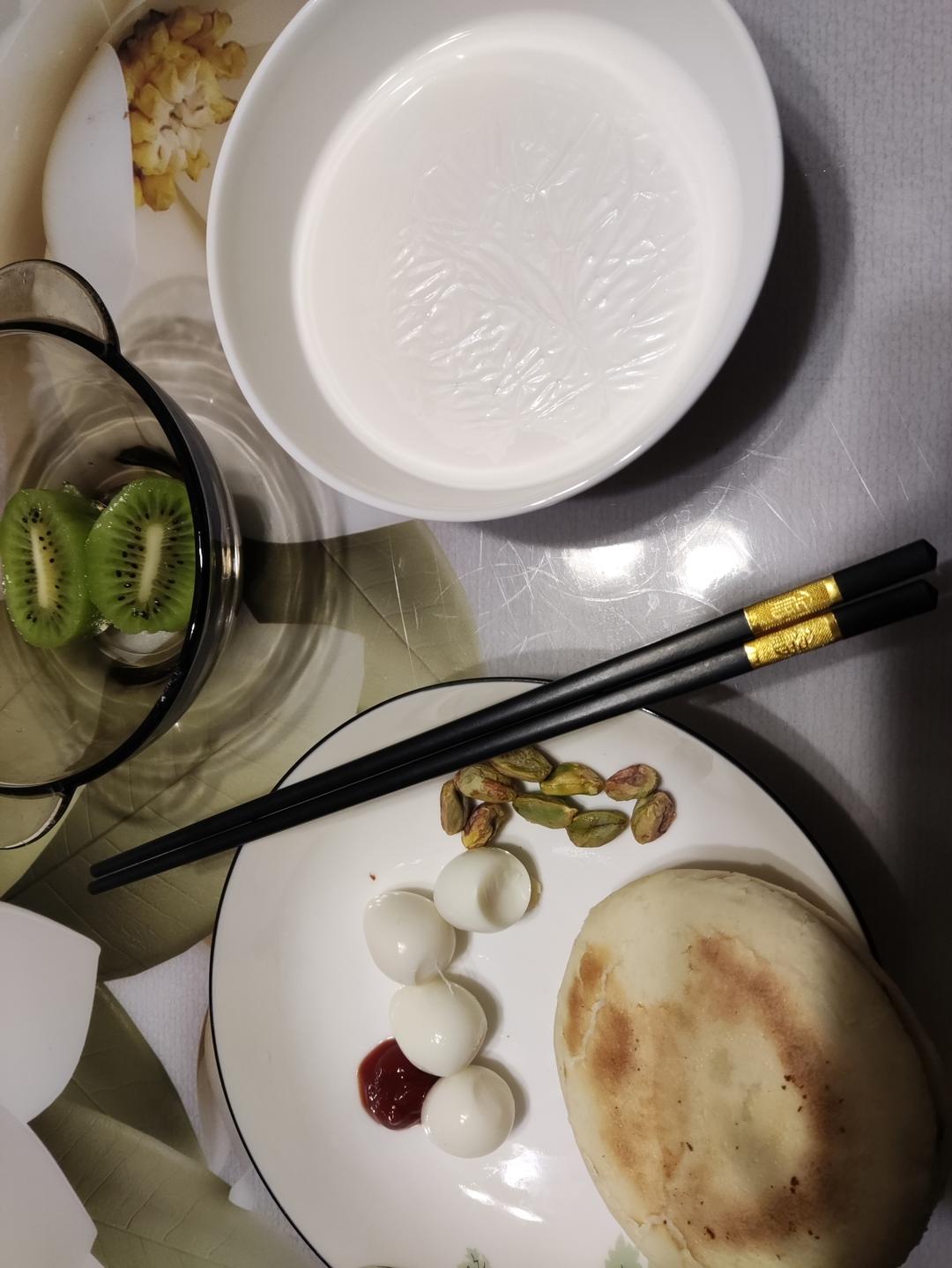 肉夹馍,鹌鹑蛋,坚果,牛奶😊