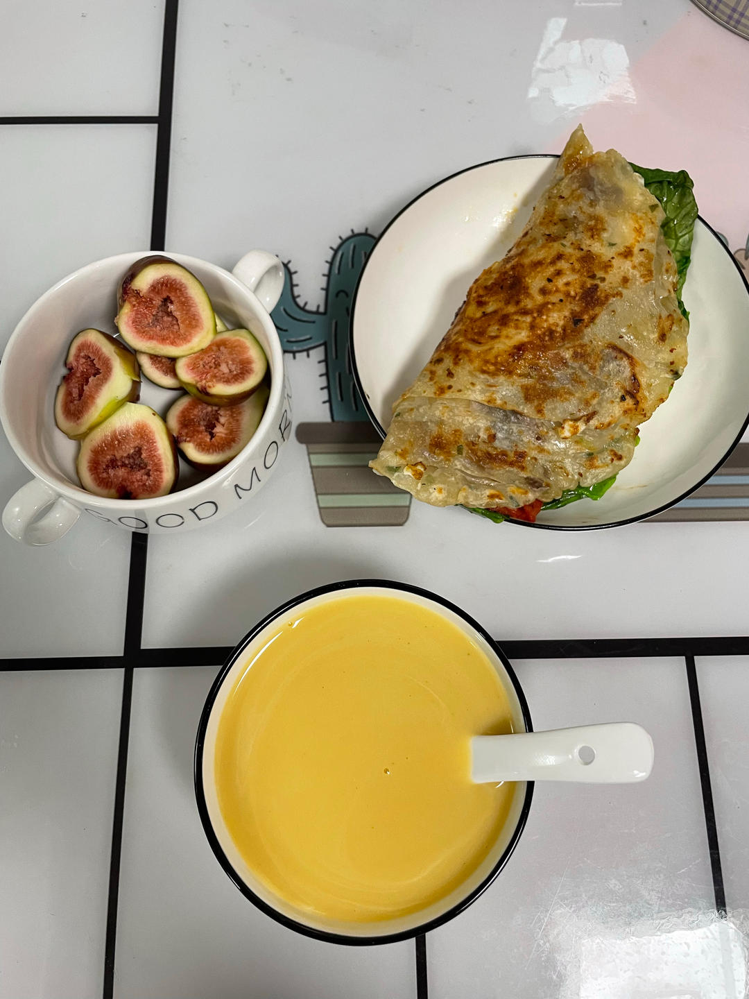20221104圣迪乐鸡蛋茶+豆浆+油条+油饼+奶黄包+马拉糕+肉包+柿子。