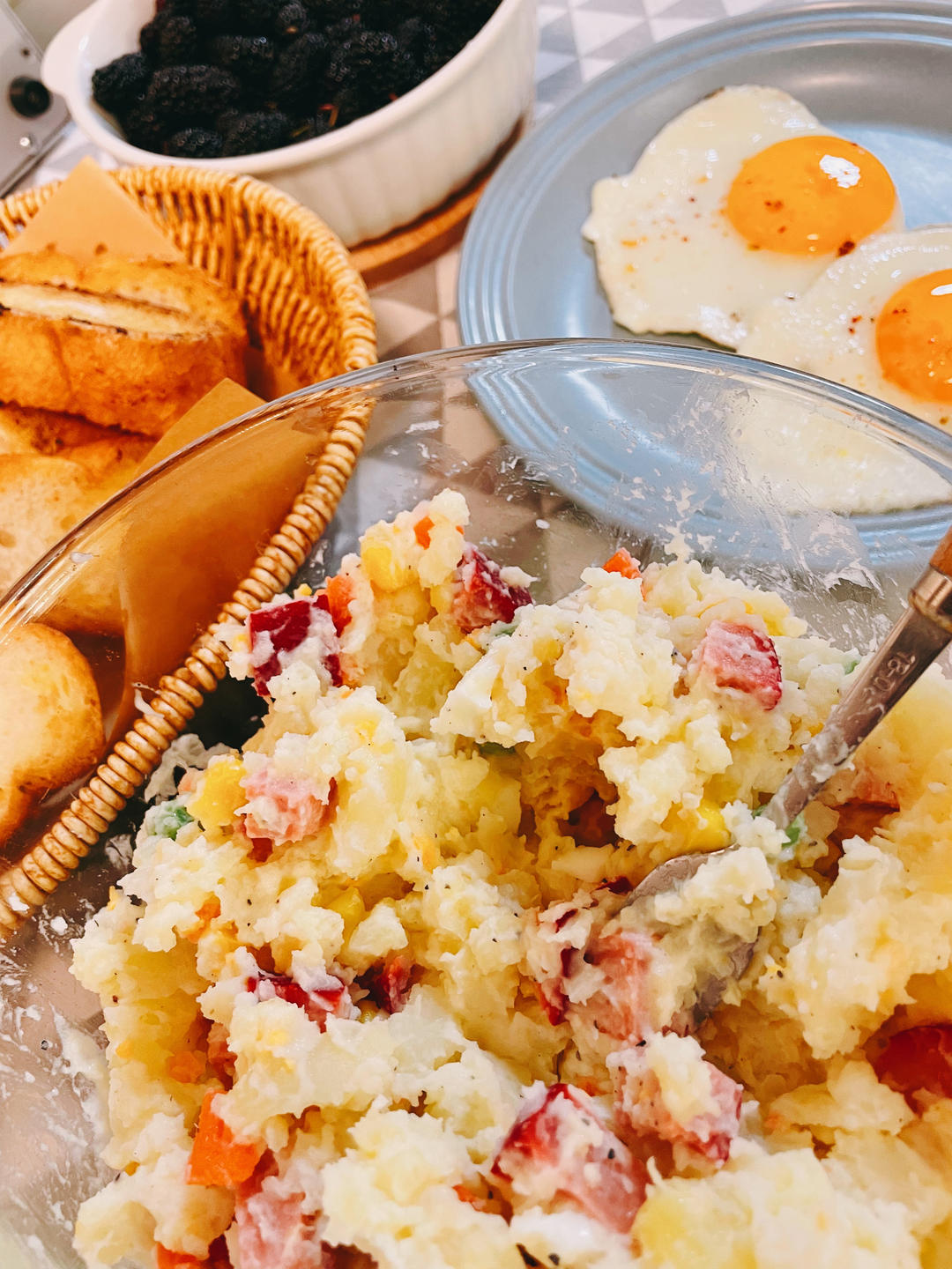 贝贝挚爱—红肠土豆泥沙拉🥔黄油蒜香法棍🥖煎蛋🥚桑葚