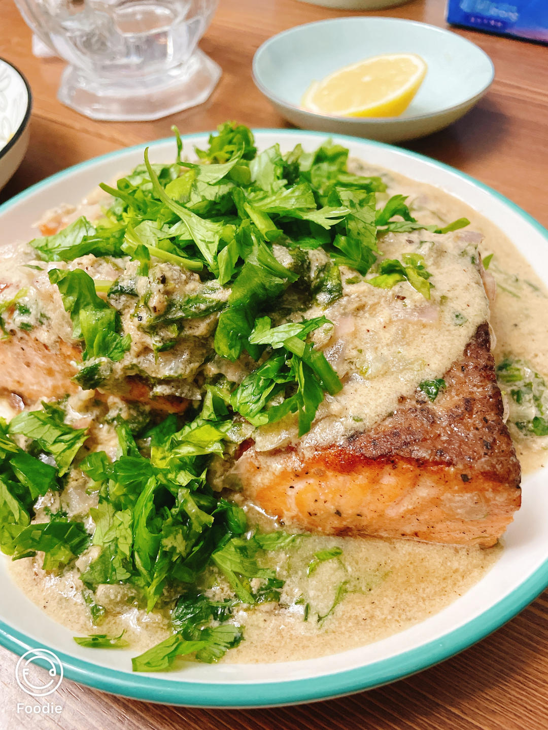 煎三文鱼(还加了汁炖煮了),玉米蛋花羹
