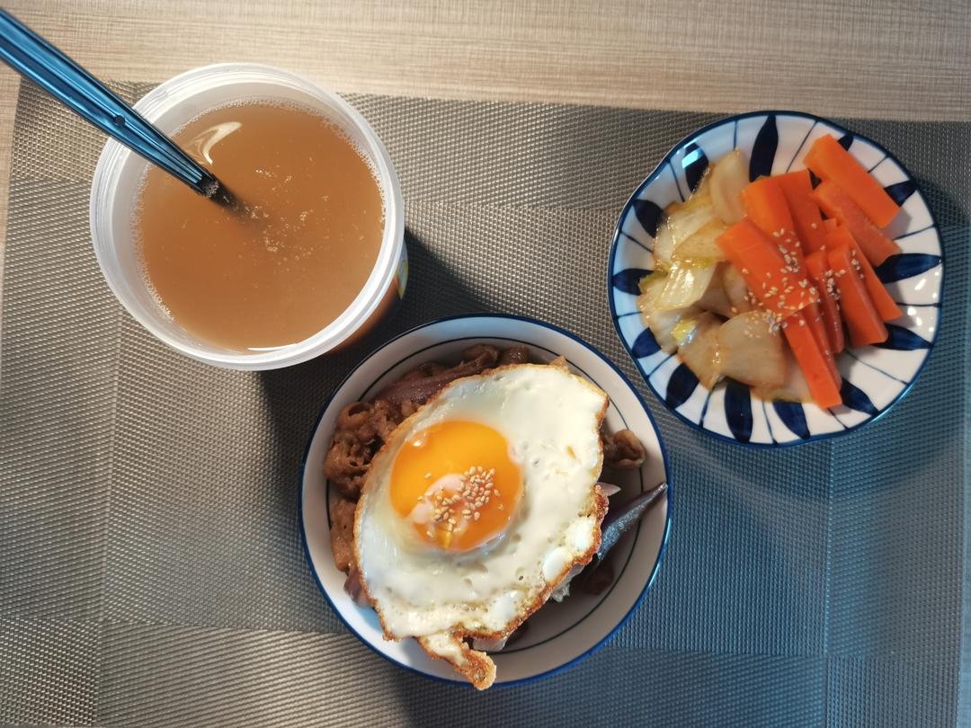 洋葱肥牛饭+煎蛋,用剩的汤汁焯了下蔬菜。