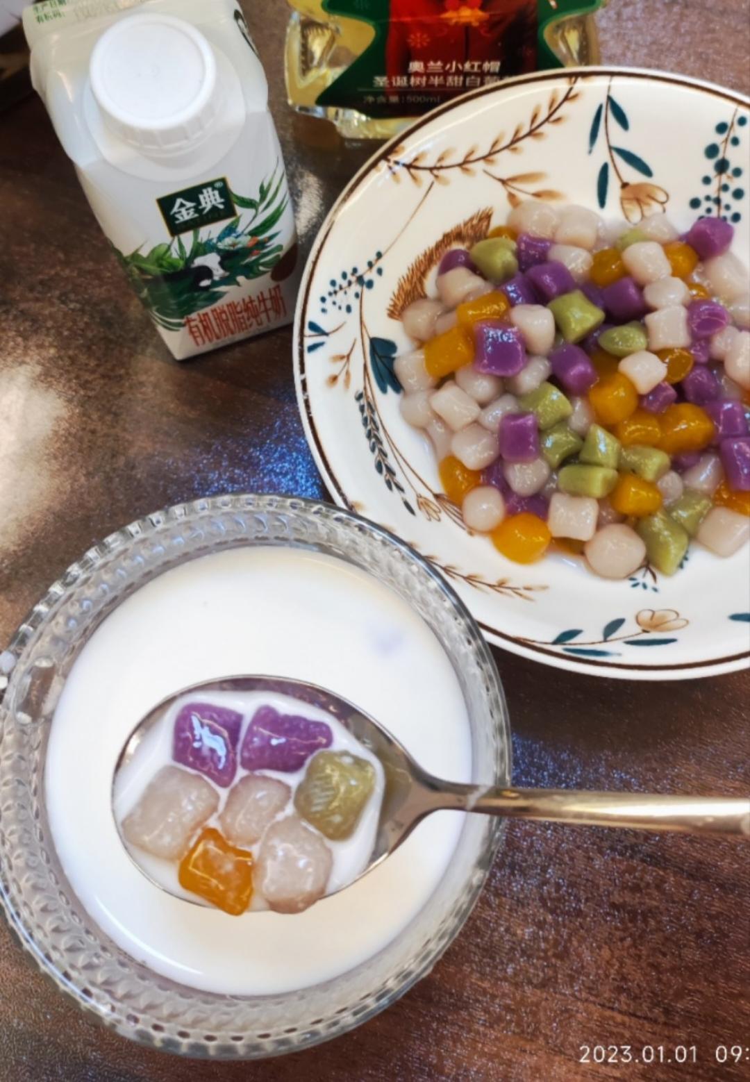 今天早餐比平时晚,孩子不用上学,大人不用上班,九点多才吃饭。煮点手工芋圆吧 ,软软糯糯的,...