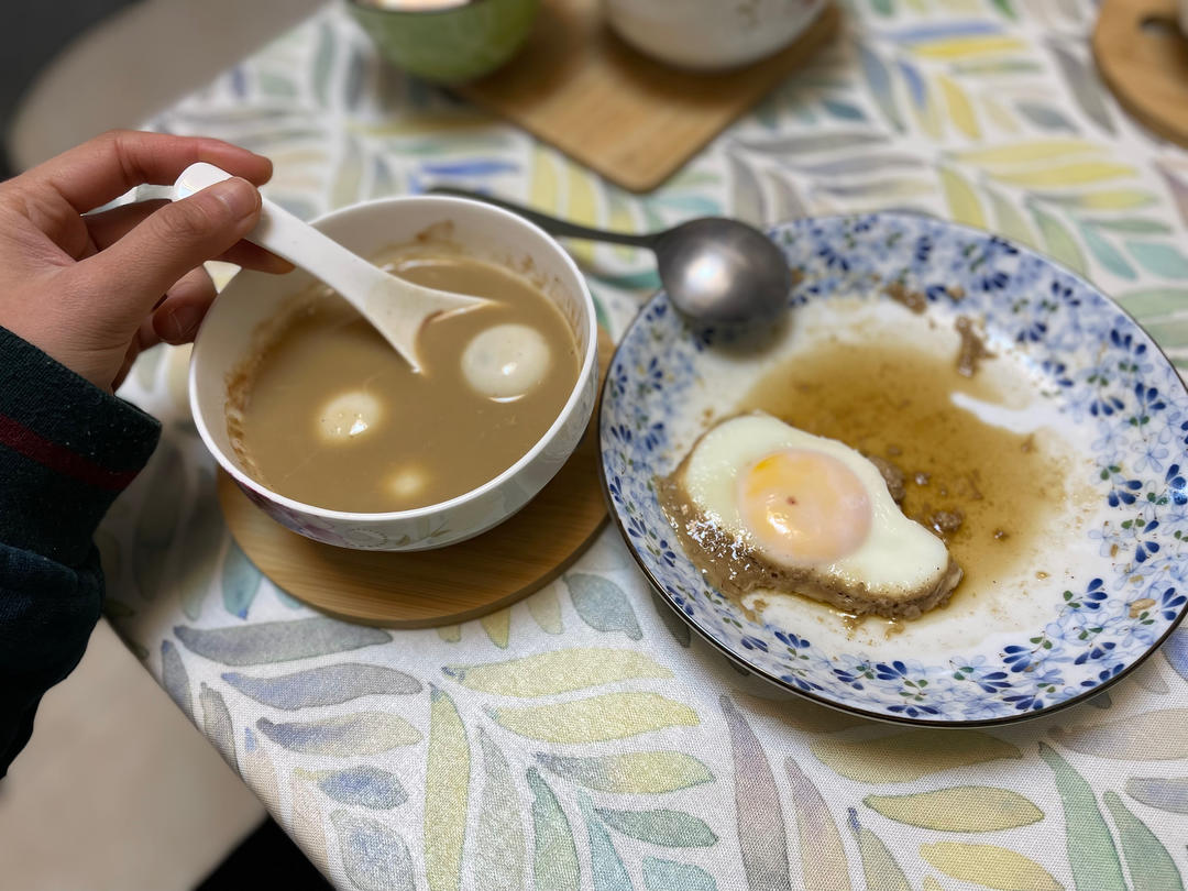 湯圓放入紅豆豆漿中😋圓圓滿滿,再配個醬油蛋
