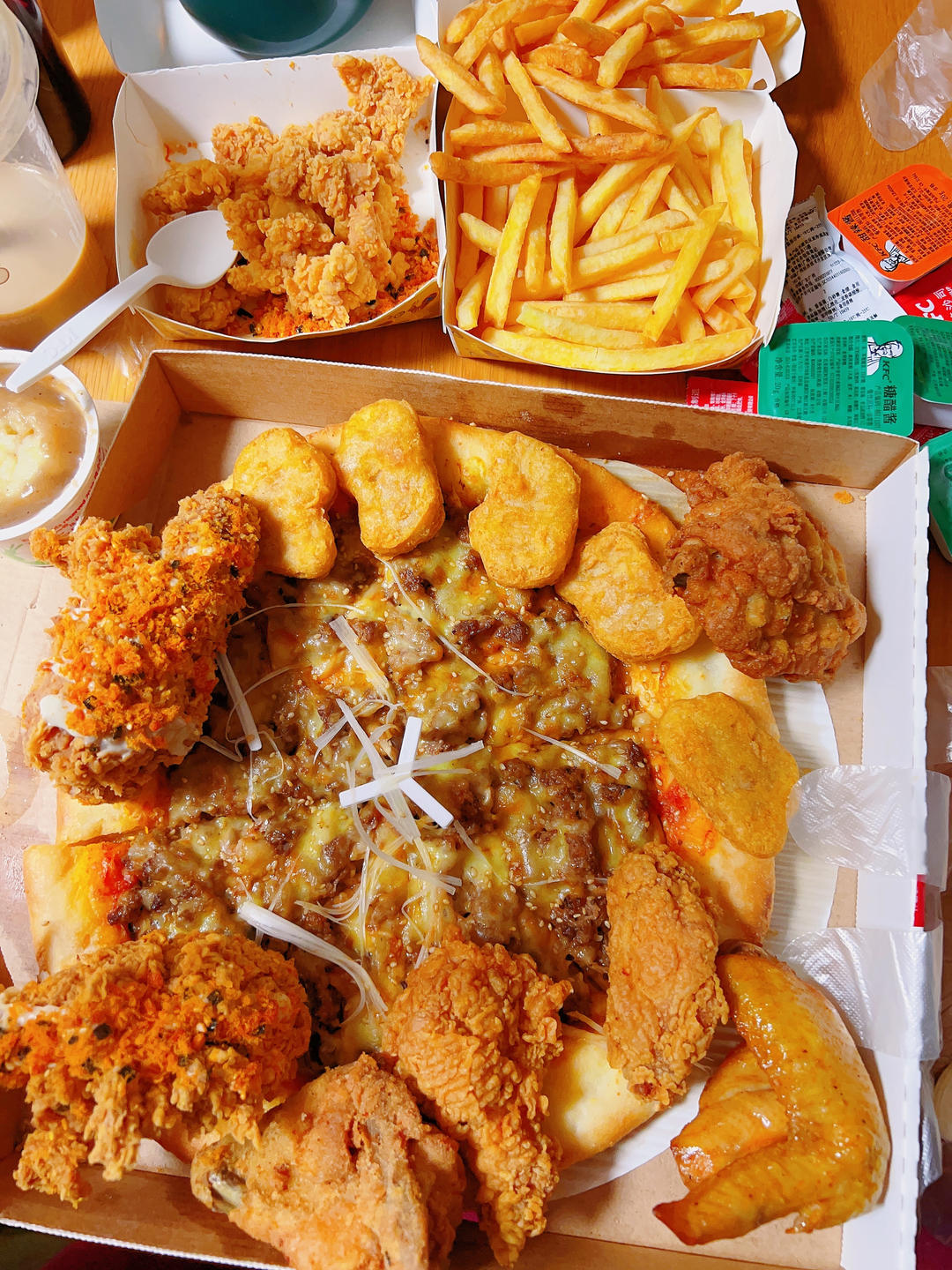 老公去买了必胜客的披萨,肯德基的鸡翅和鸡块和小吃。晚上的晚餐!
