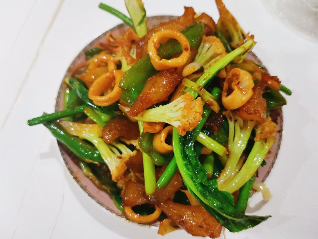 👉炒猪筋鱿鱼青椒花菜蒜苔