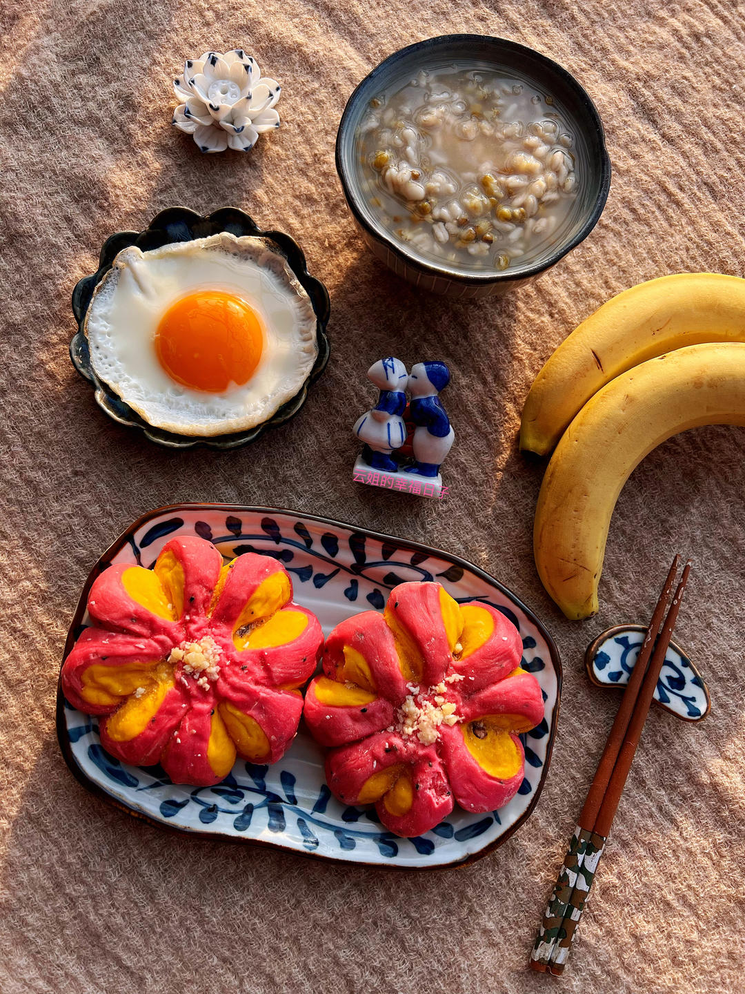 双色花面包➕煎蛋➕麦仁绿豆粥➕香蕉……🌹亲们,祝安好🤝