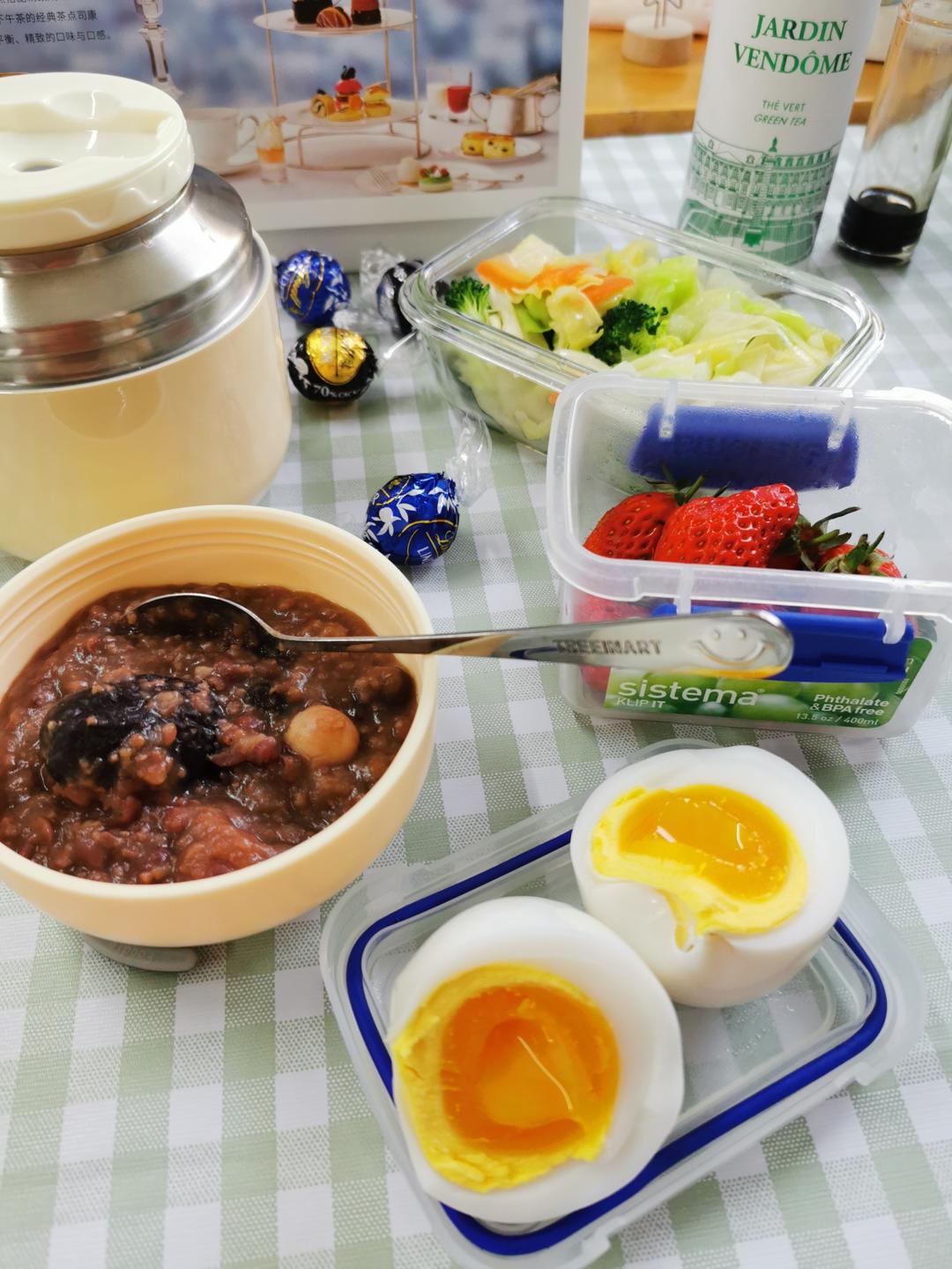 工作日早餐:红枣杂粮粥、煮鹅蛋、烫蔬菜、草莓。