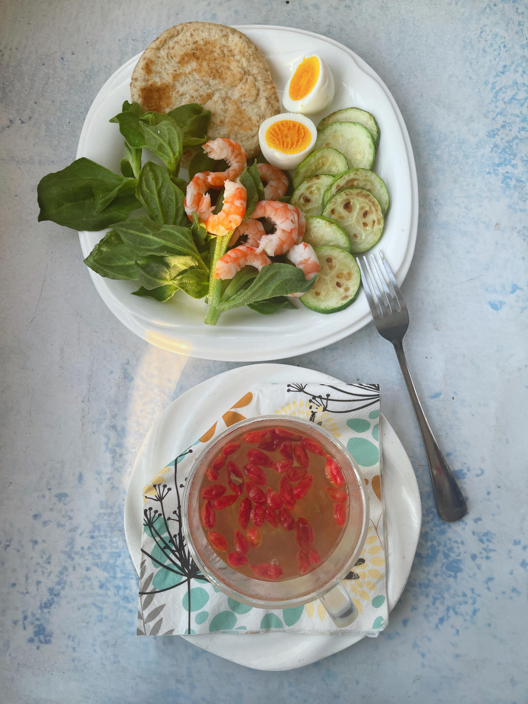 工作日早餐:虾仁+冰草+煎西葫芦+水煮蛋+全麦饼+枸杞水。