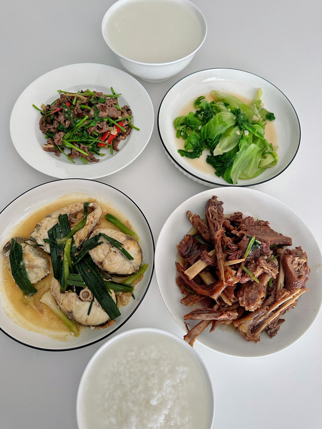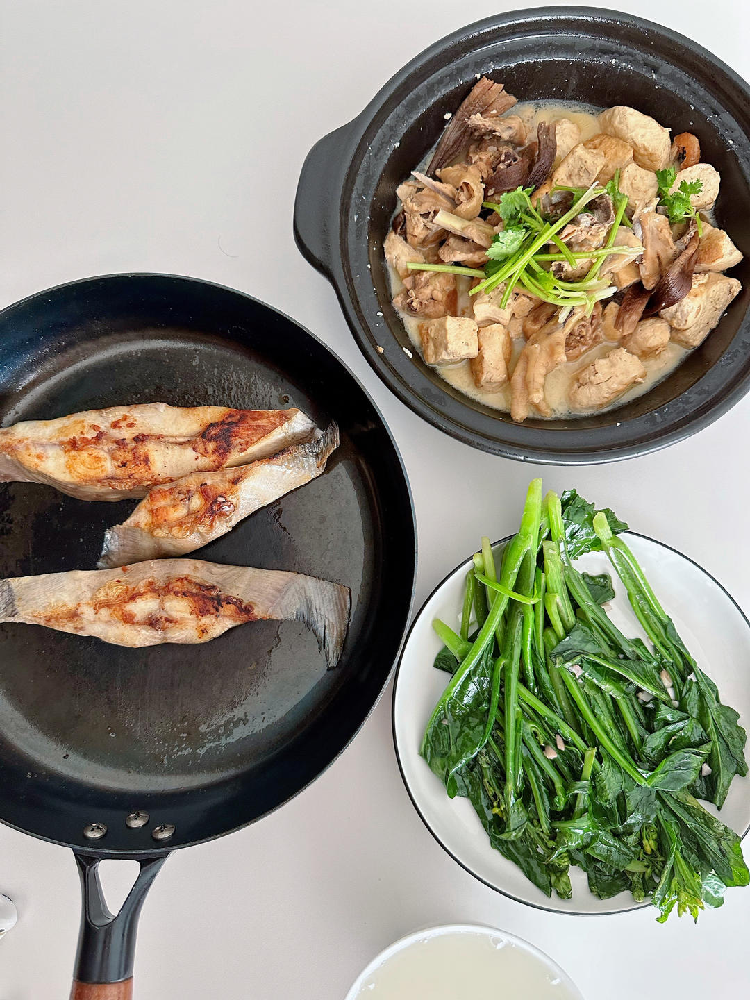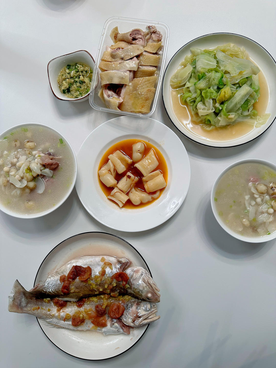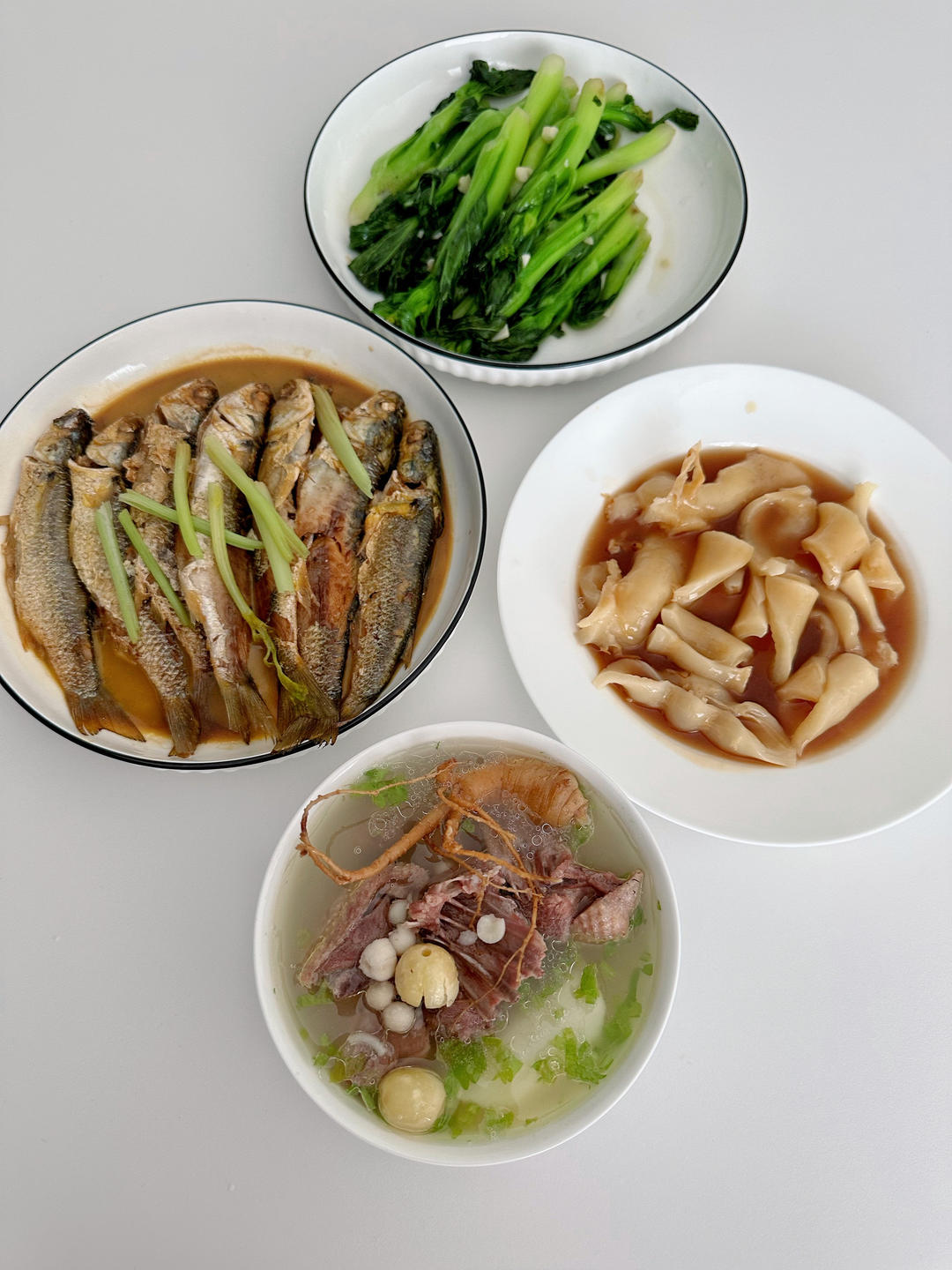 人参石斛鱼胶山药芡实麻鸭汤,鱼,菜心。