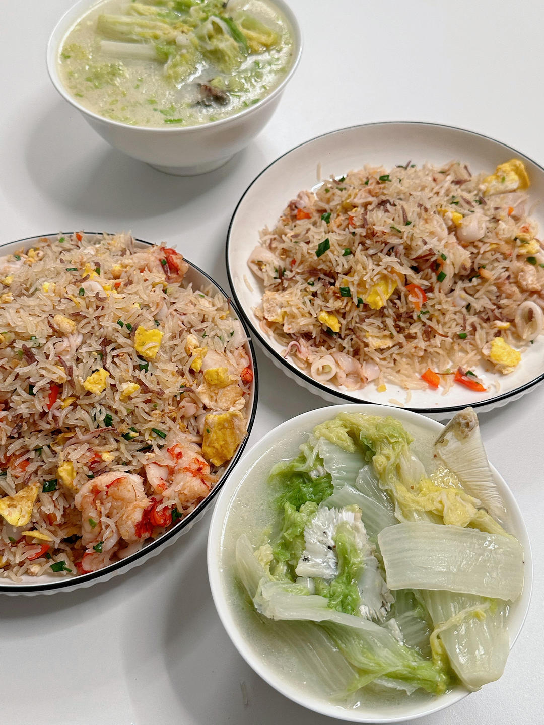鱼头银丝菜汤,海虾鱿鱼炒饭。