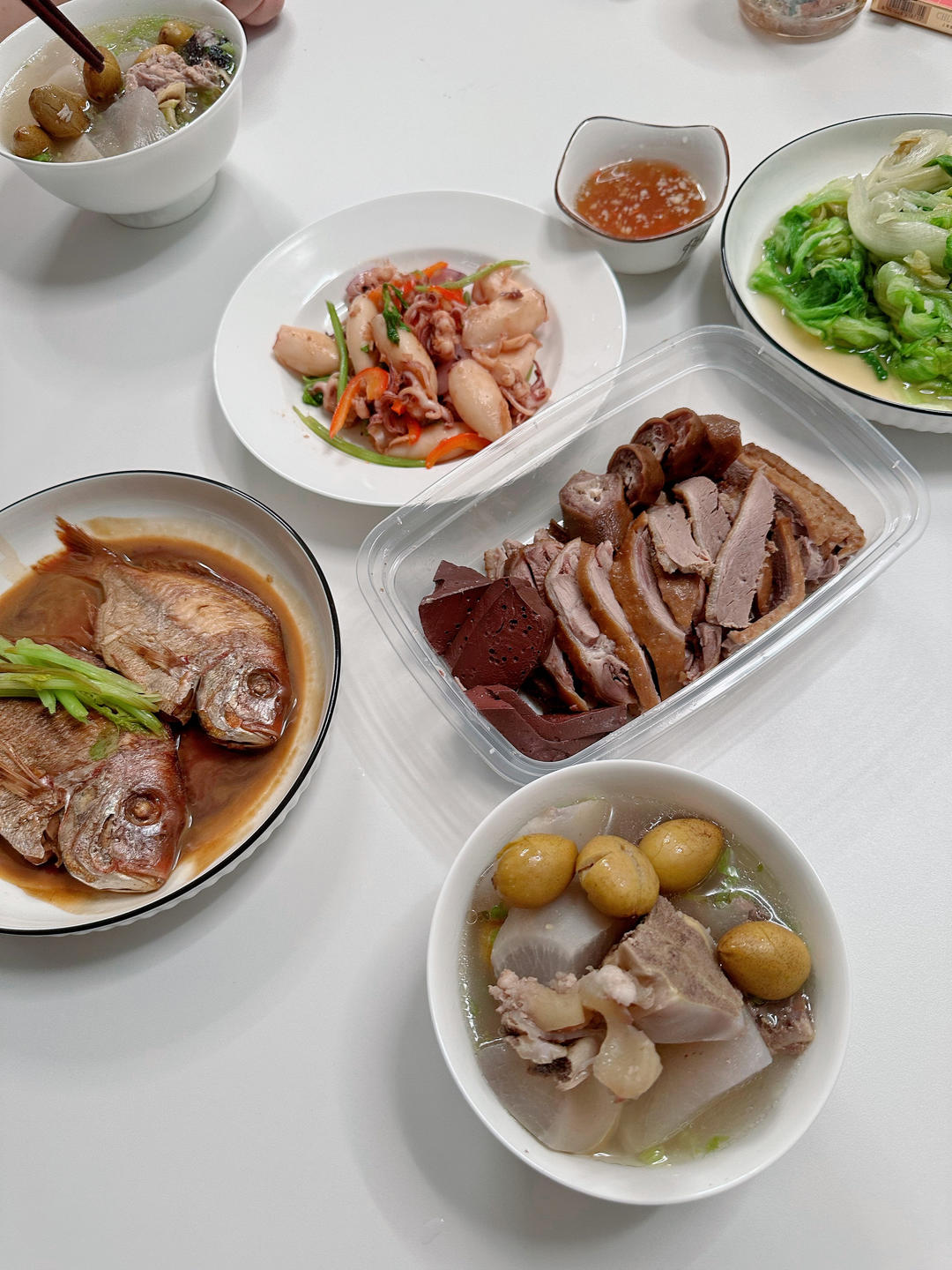 橄榄白萝卜筒骨鸡汤,红立,鱿鱼,鹅肉,西生菜。