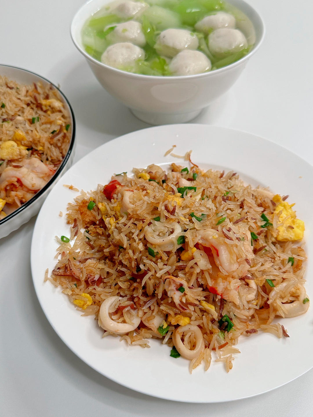 鱼丸青瓜汤,海虾鱿鱼炒饭