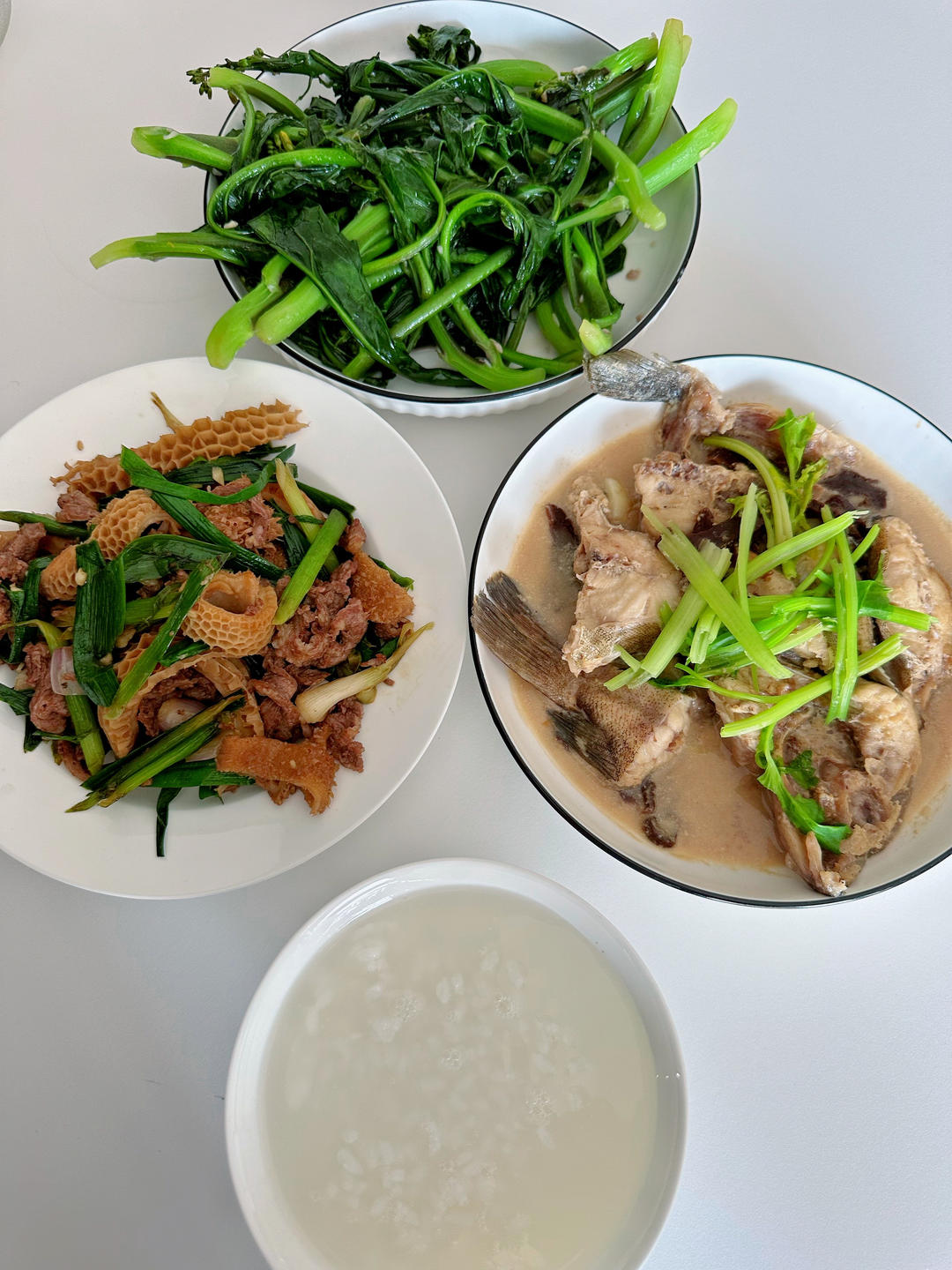萝卜干焖石斑鱼,肥炳牛肚,芥蓝。