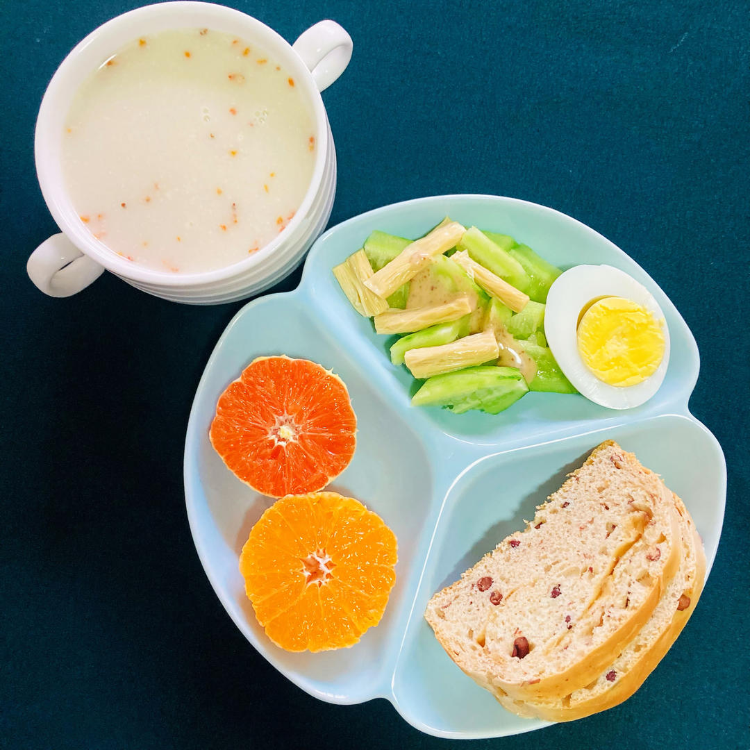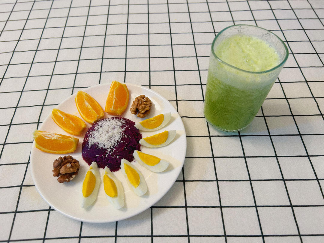 鸡蛋,椰蓉紫薯,核桃,黄瓜菠菜汁,🍊