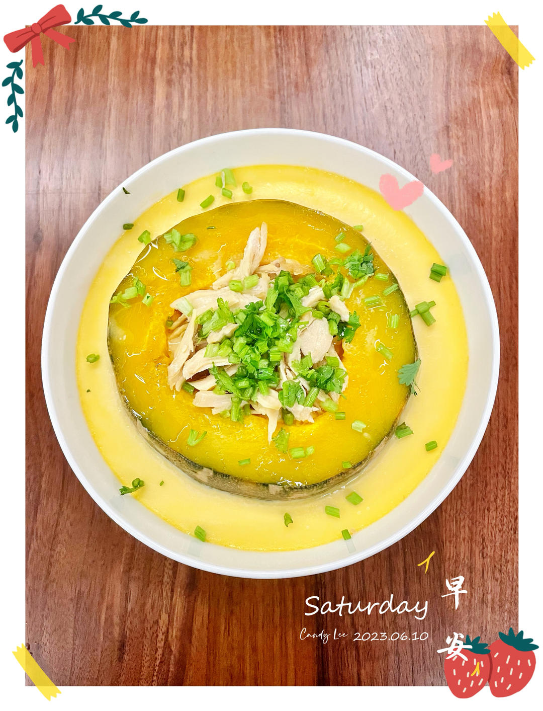 南瓜蒸鸡蛋加上鸡胸肉和香菜碎,又是一道健康美味的美食,周末愉快[胜利][太阳]
