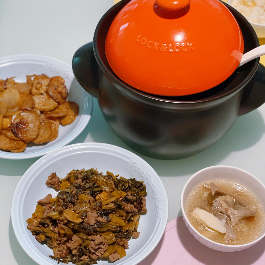 酸菜炒牛肉末/土豆肉饼/淮山鸽子排骨汤