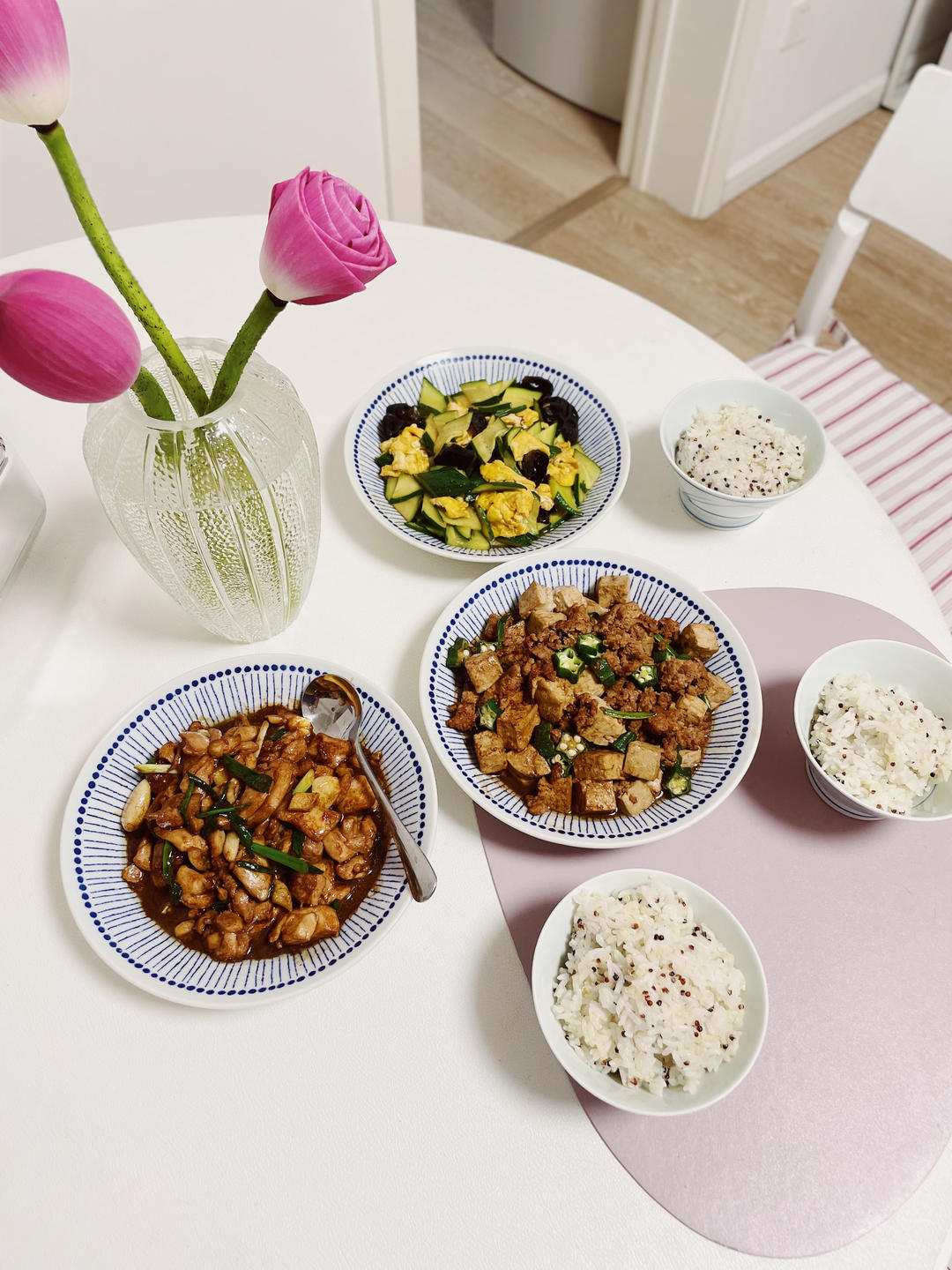 豆豉秋葵黑豆腐,蚝油鸡腿肉,鸡蛋黄瓜片