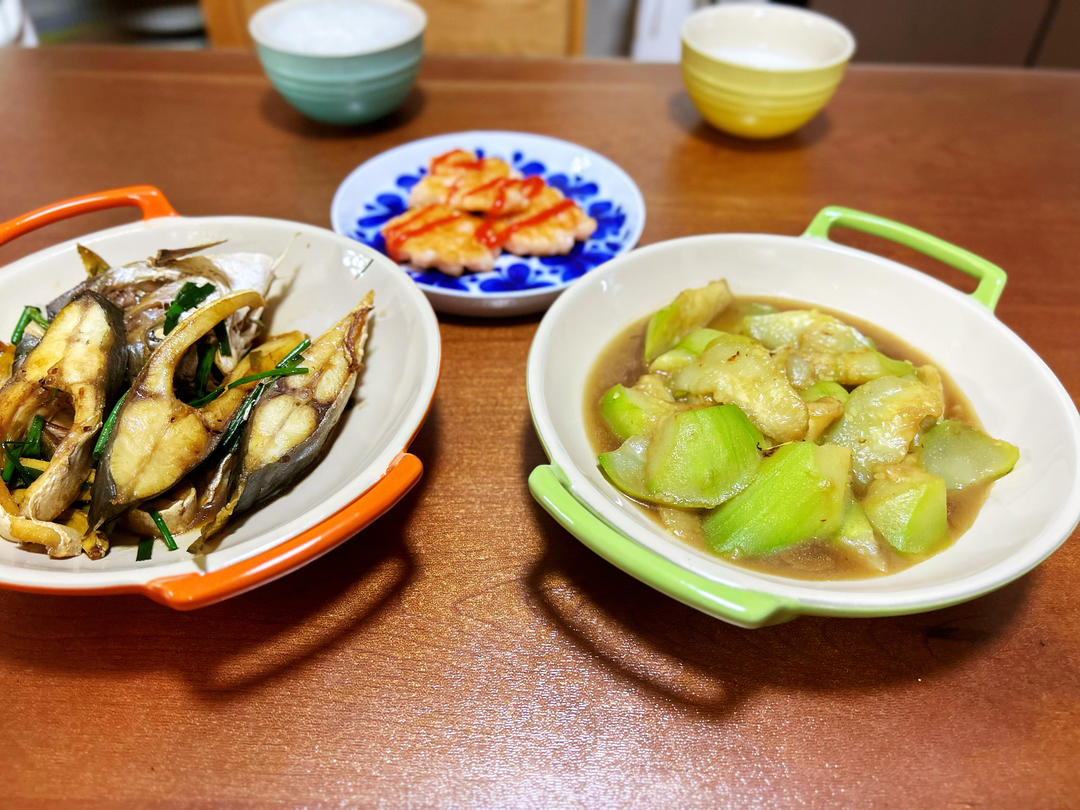 蚵鱼、丝瓜、煎虾滑
