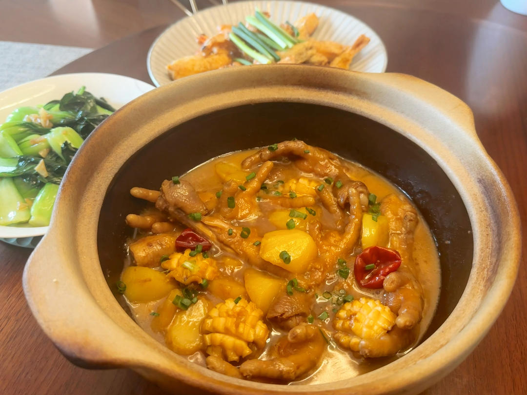 鲍鱼鸡爪烧土豆、咸蛋黄罗氏虾&轻炒上海青