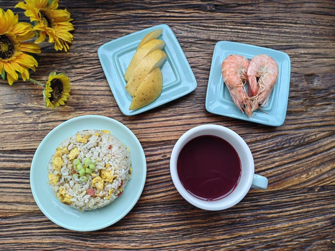 杨梅汁🍹+蛋炒饭🍚+虾🦐+梨
