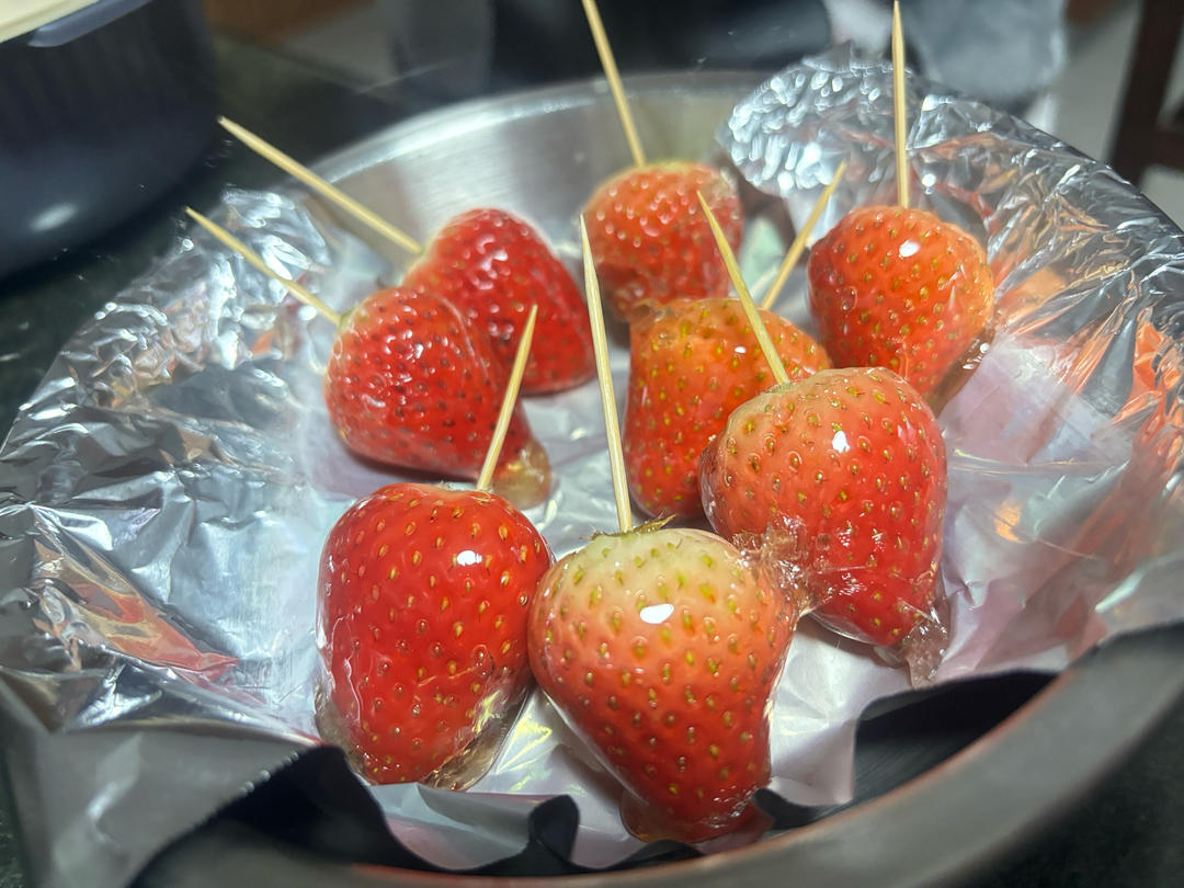 焦糖做法:3勺糖1勺水(3:1)比例,水果多可适量增量,微波炉高火1分30秒,...