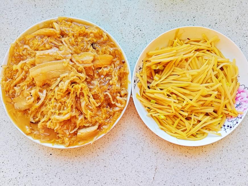 12.17午餐:猪肉酸菜炖粉条,清炒土豆丝,燕麦白米饭