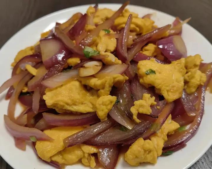 鸡蛋打散加盐炒一下出锅,洋葱不吸油,少放点油炒洋葱,加生抽耗油炒均匀,加入鸡蛋翻炒后出...