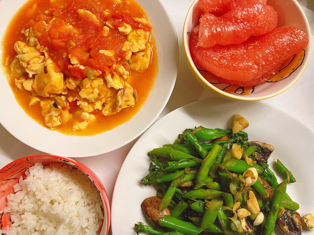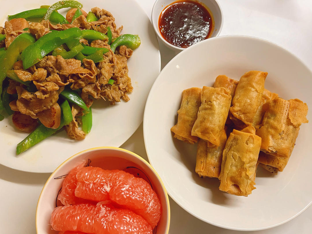 青椒炒肉,炸春卷,柚子