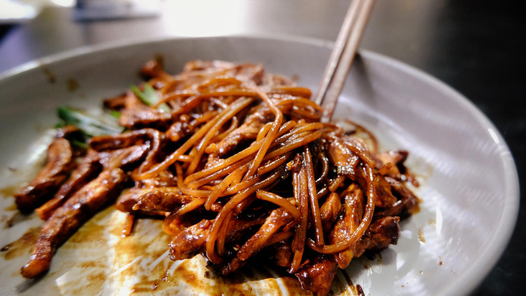 京酱肉丝里除了酱就没碳水,所以我决定放点意面一块炒。本来觉得我创造了大fusion,炒着炒着一闻哦嚯其实就是炸酱面😂不过...