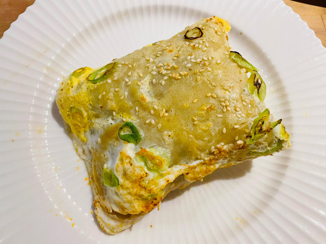 400克面粉+150克玉米面混合起来做的面糊,放了刚炸的油条,涂了豆瓣酱和老干妈辣椒酱🌶️...