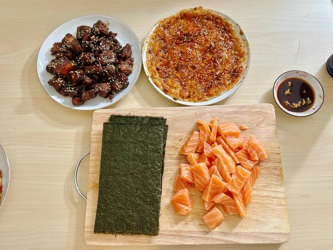 三文鱼刺身配海苔 还有喷枪炙烤三文鱼