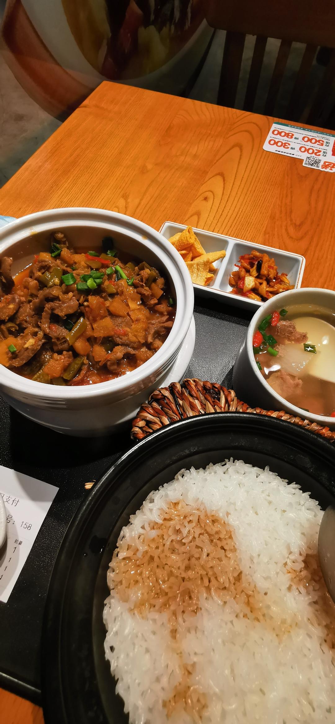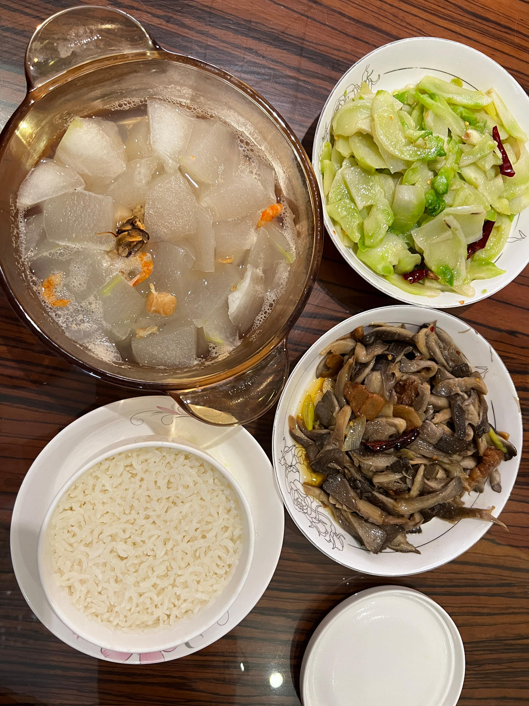 清炒儿菜,蘑菇炒肉,冬瓜干贝汤,米饭。