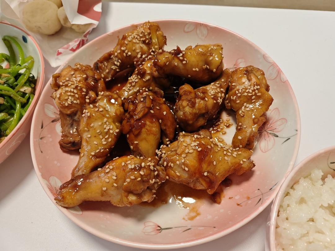 橙汁鸡翅/蚕豆虾仁/松茸鲜西兰花/花蛤丝瓜汤,绿豆胚芽米大米饭