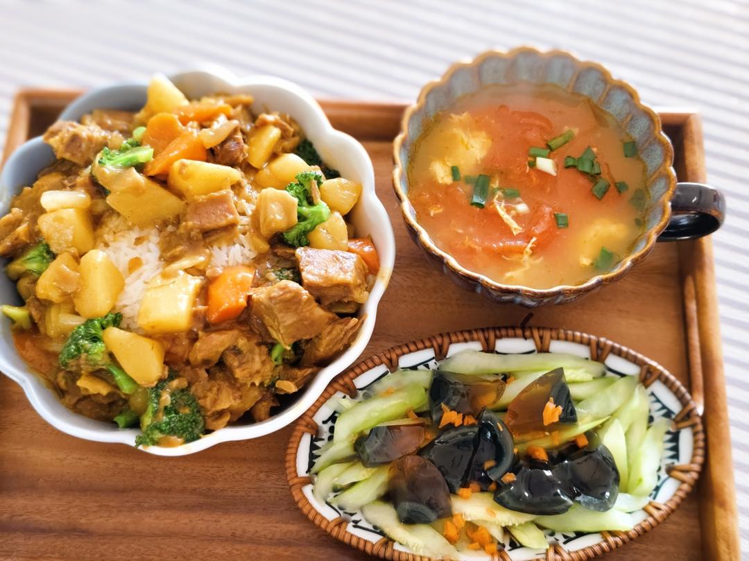 咖哩牛肉饭 黄瓜拌皮蛋 番茄蛋汤