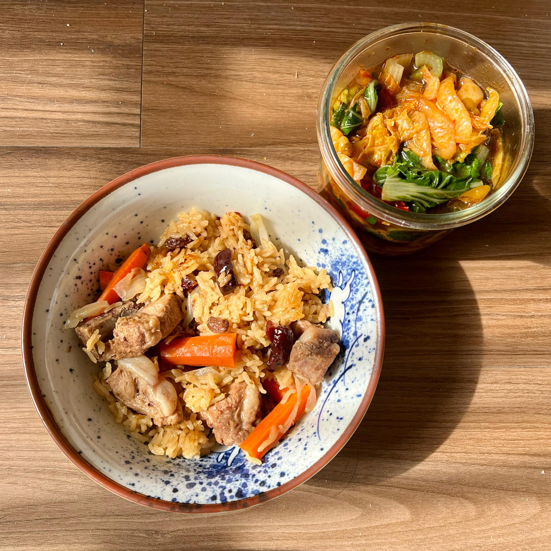 p5早上出门前就炖了排骨+米和配菜在电饭锅里摆好,中午回来按下煮饭键就行。长白菜丢排骨汤里水煮,和昨天剩下的腌...