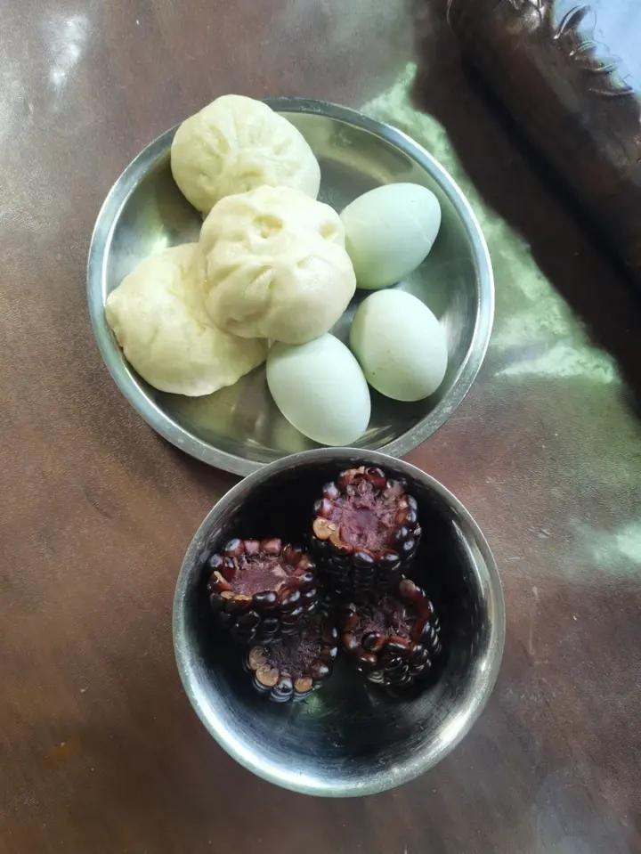 早餐 鸭蛋🥚黑玉米🌽小混沌 肉包子是妈妈做的❤️❤️❤️