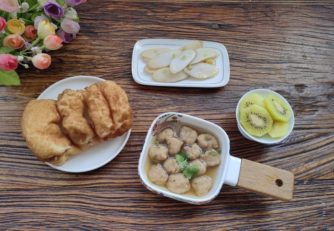 丸子汤🥣+甜油条🍥+炒山药🥗+猕猴桃🥝