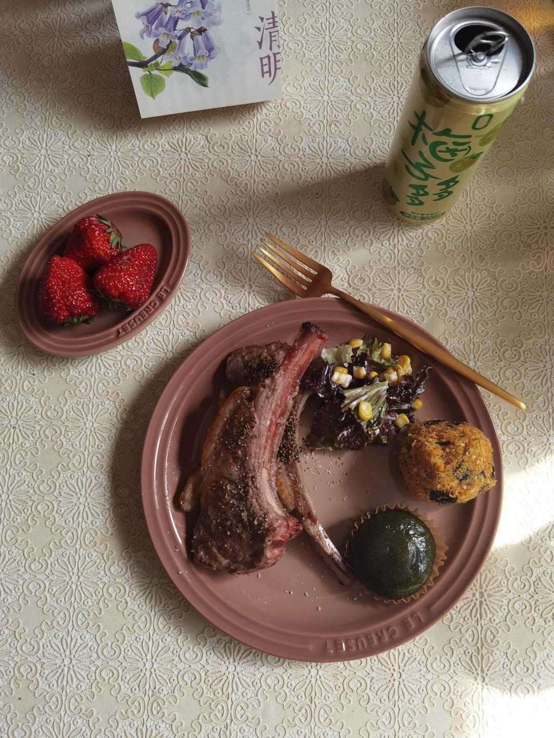 小羊排 沙拉 肉松小贝 青团 草莓 梅子多多