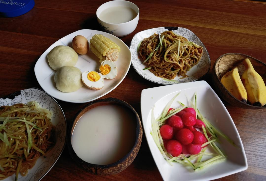 红豆包、卤蛋、糯玉米