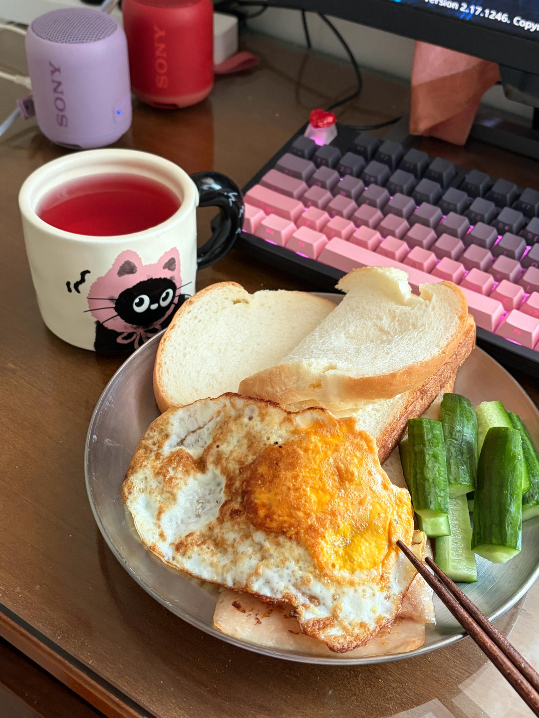 鲜奶吐司,其中一片抹了奶酪。煎蛋,spam鸡午餐肉,小青瓜
