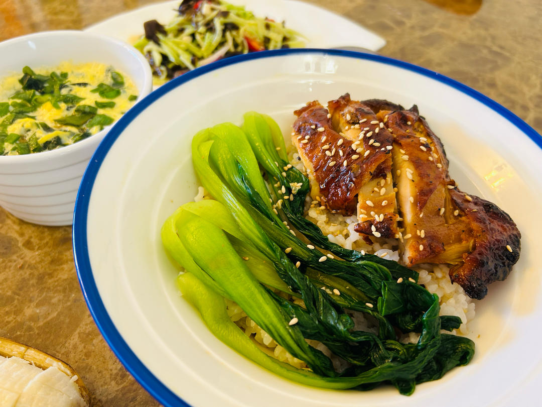 鸡腿饭,拌菜,海菜汤,香蕉