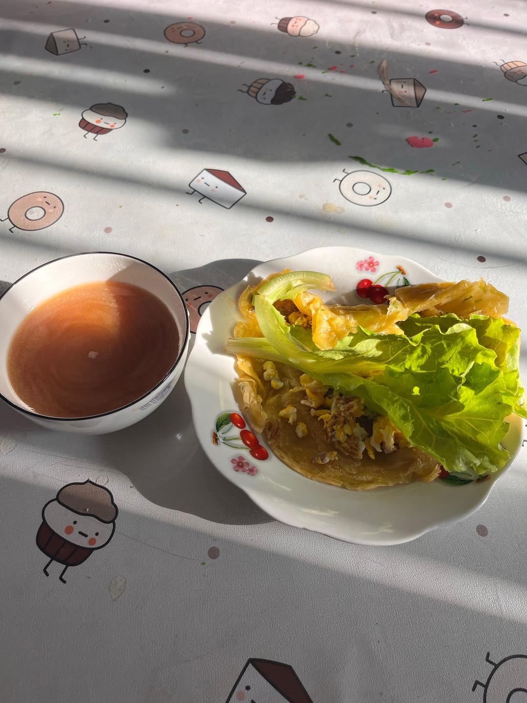 一个手抓饼,里面放了鸡蛋和生菜,还有一碗阿胶饮品。
