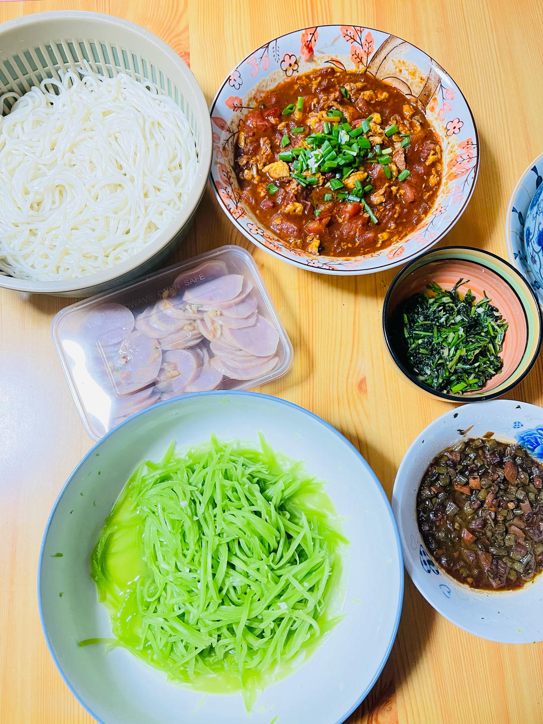 豆角肉末酱 西红柿酱面 凉拌笋丝 油爆香菜