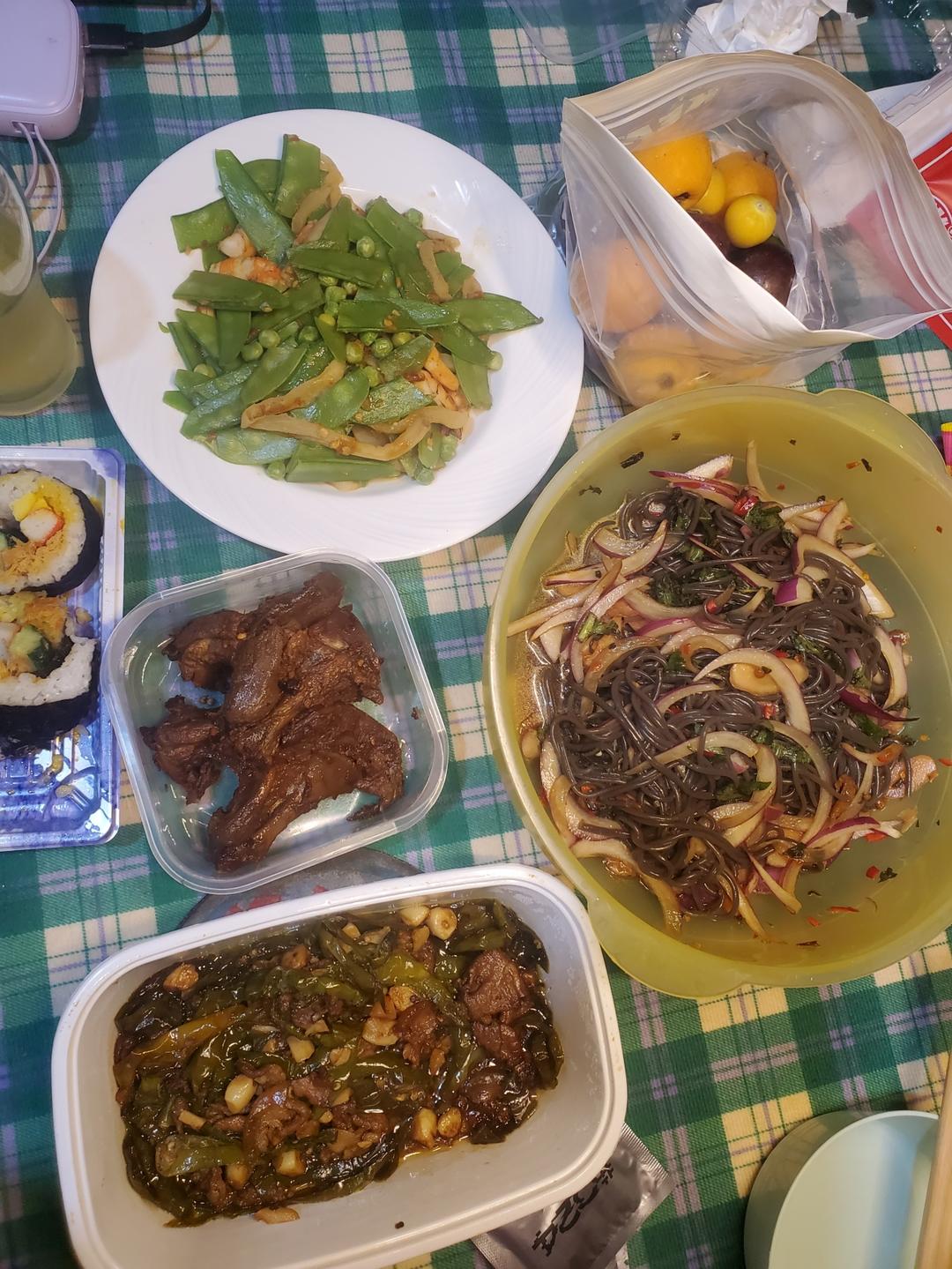 凉拌蕨根粉,荷兰豆豌豆大虾炒萝卜干,剩菜