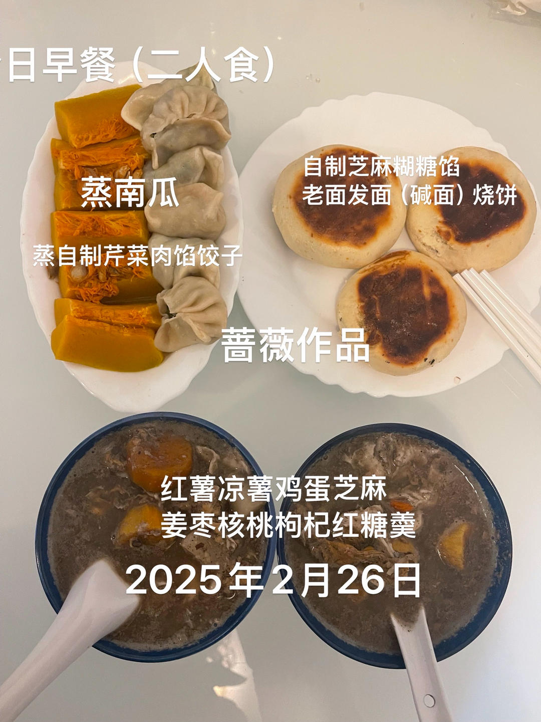 今日早餐(二人食):自制芝麻糊糖馅老面发面(碱面)烧饼、蒸南瓜、蒸自制芹菜肉馅饺子、红薯凉薯鸡蛋姜枣核桃枸杞芝麻红糖羮!...