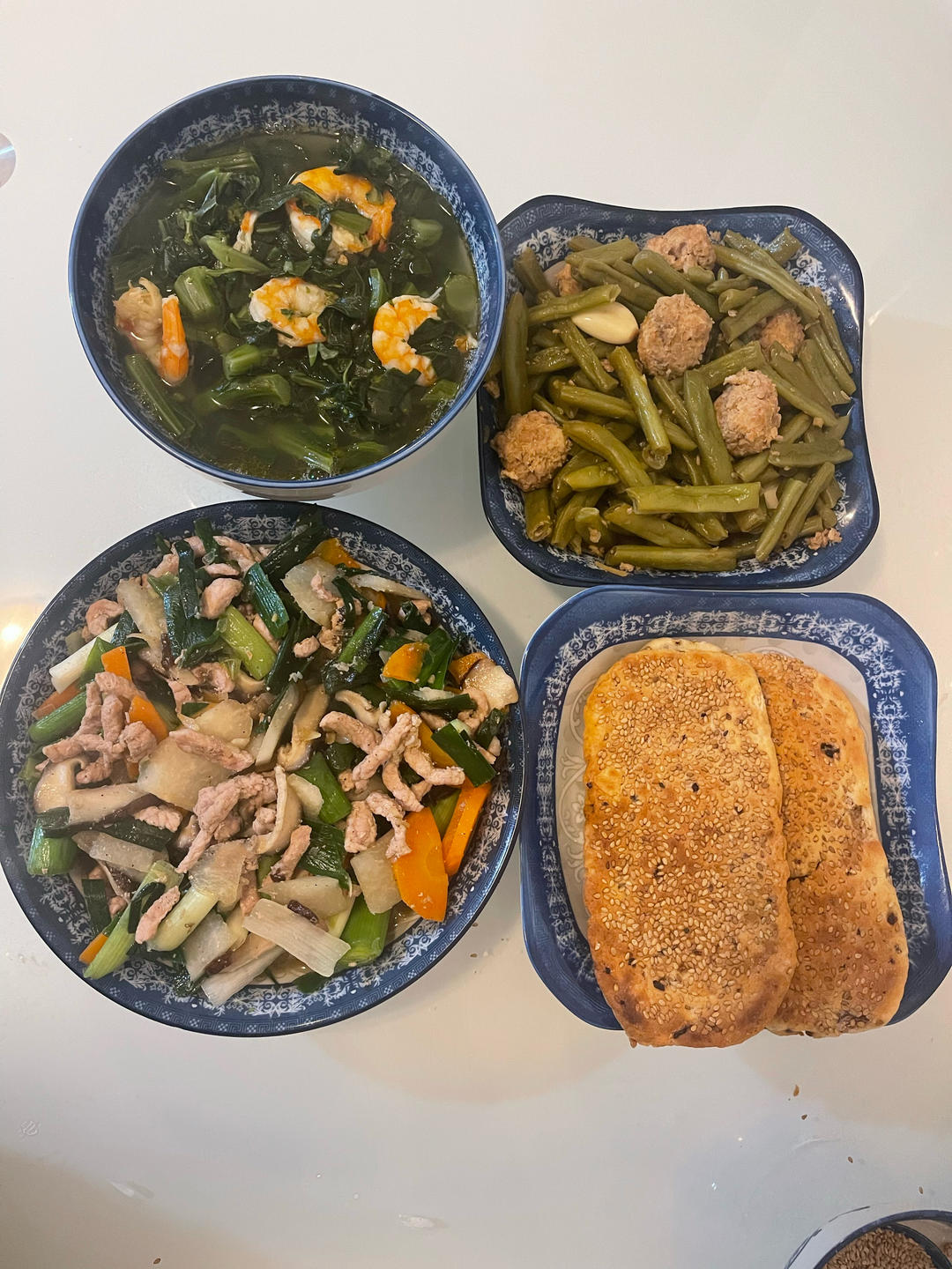 今天上午的工作,和面,等待发酵,做麻酱饼。做酱,用肉粒和自己做的西瓜黄豆酱熬制的,面发酵好了揉面,涂酱等一系列制作流程,...