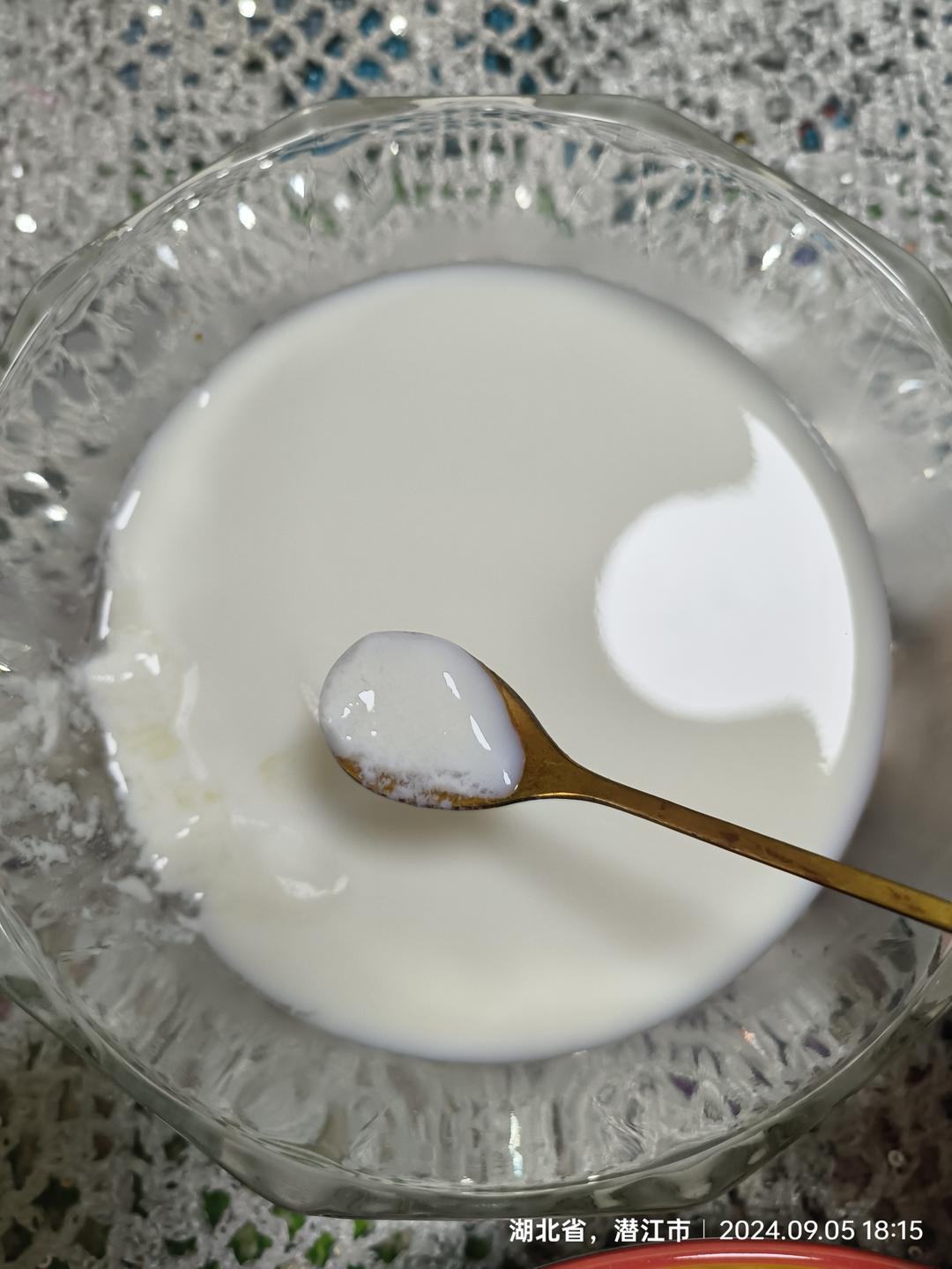 自己做的米酒,鲜奶按照 3:1的比例切个水果的时间就凝固了,嫩嫩的像豆腐脑,味道也不错。
