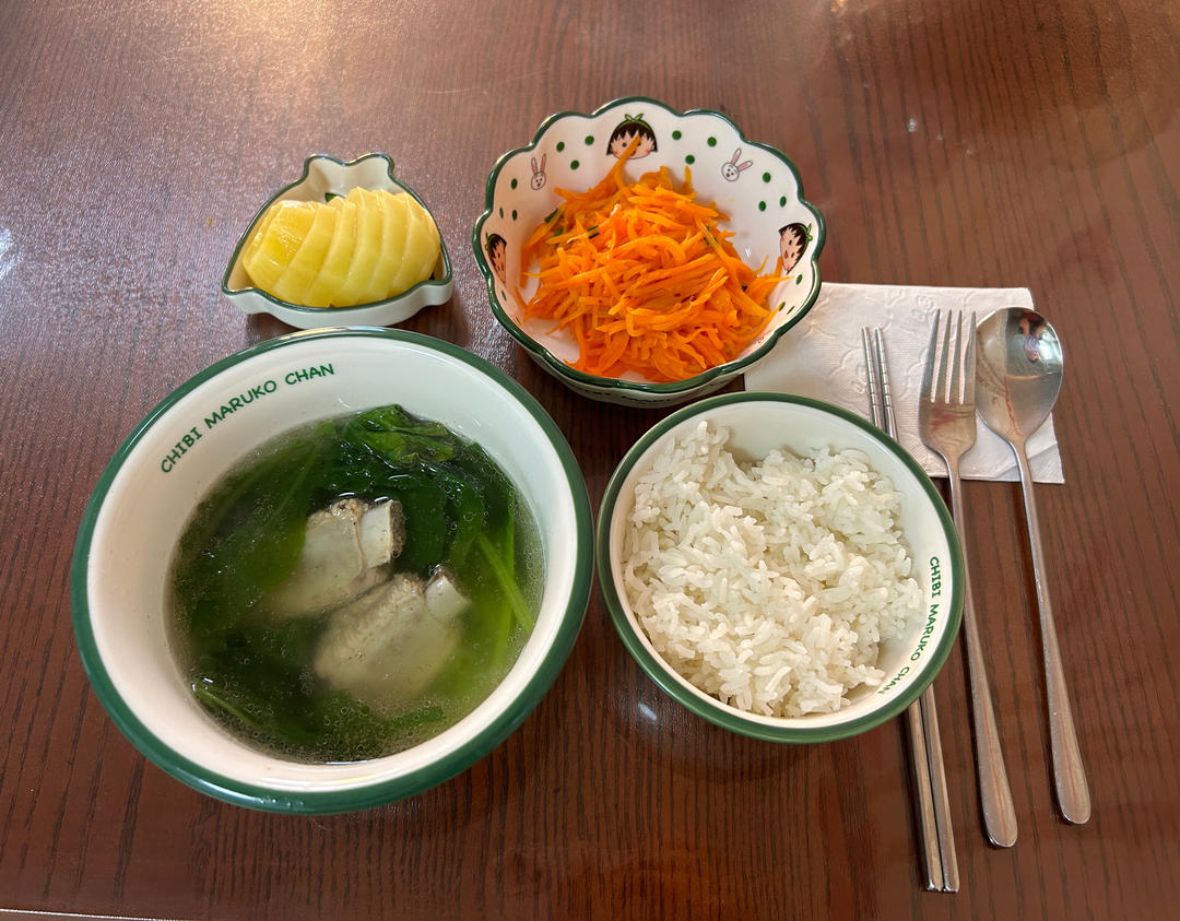 排骨小白菜汤,米饭,炒胡萝卜丝,猕猴桃