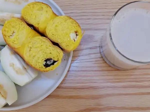2024.10.16 早餐 南瓜奶酪巧克力贝果+核桃红枣豆浆