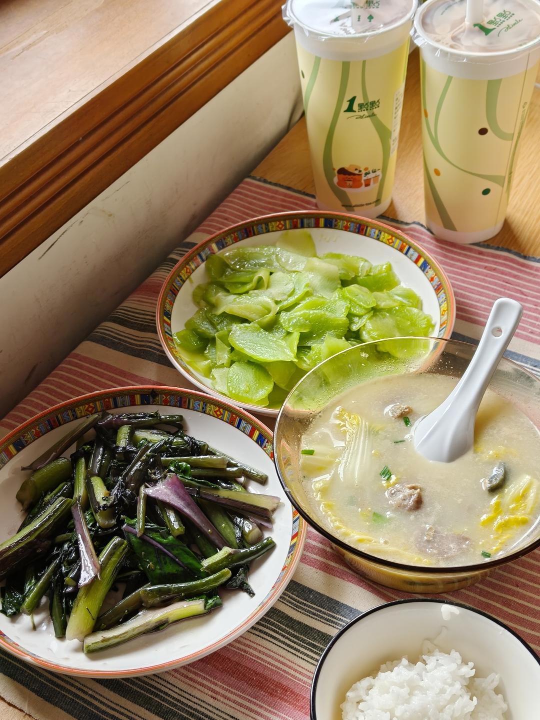 🍁竹荪鸡汤、鸡汤泡饭、红菜苔、烤鸡翅、牛肉卷、榴莲大福、瑞士卷。